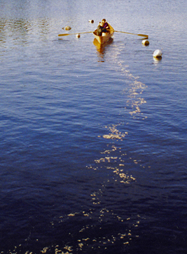 Sowing two rows, each of them a containerfull of oats from the mill,